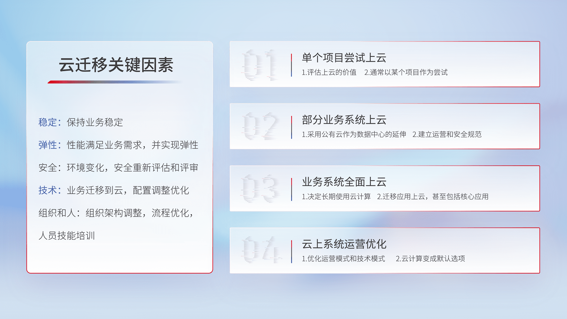 结合实际业务,,从规划设计、、、云平台选型、、云原生改造、、、数据迁移、、、、集成交付,,,迁移全过程为客户识别最佳上云路径,,做好风险识别管理,,,,设计网络架构、、身份权限、、、安全审计合规、、、、操作审计、、日志审计、、、、监控告警策略、、、多站点容灾设计等,,,对云上基础设施进行整体规划,,,,提升IT治理水平,,以满足弹性、、、高可用、、、高性能的需求。。。