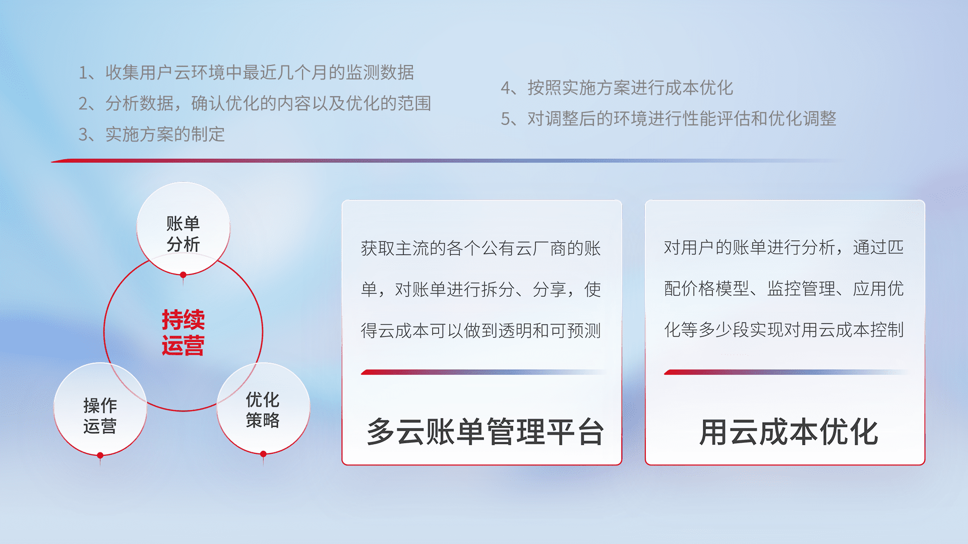 通过多云纳管,,以统一的资源数据模型把客户的云资源进行抽象和封装,,,进而实现对多云资源的统一操作,,保障云资源管理的可靠性、、、稳定性与可用性。。量身定制化运维内容,,配置、、、开发运维、、、、补丁管理、、、、备份、、监控、、、、认证和访问管理、、审计和日常巡检等,,,保障在用云过程中的可靠度,,,,稳定度以及高可用率。。。